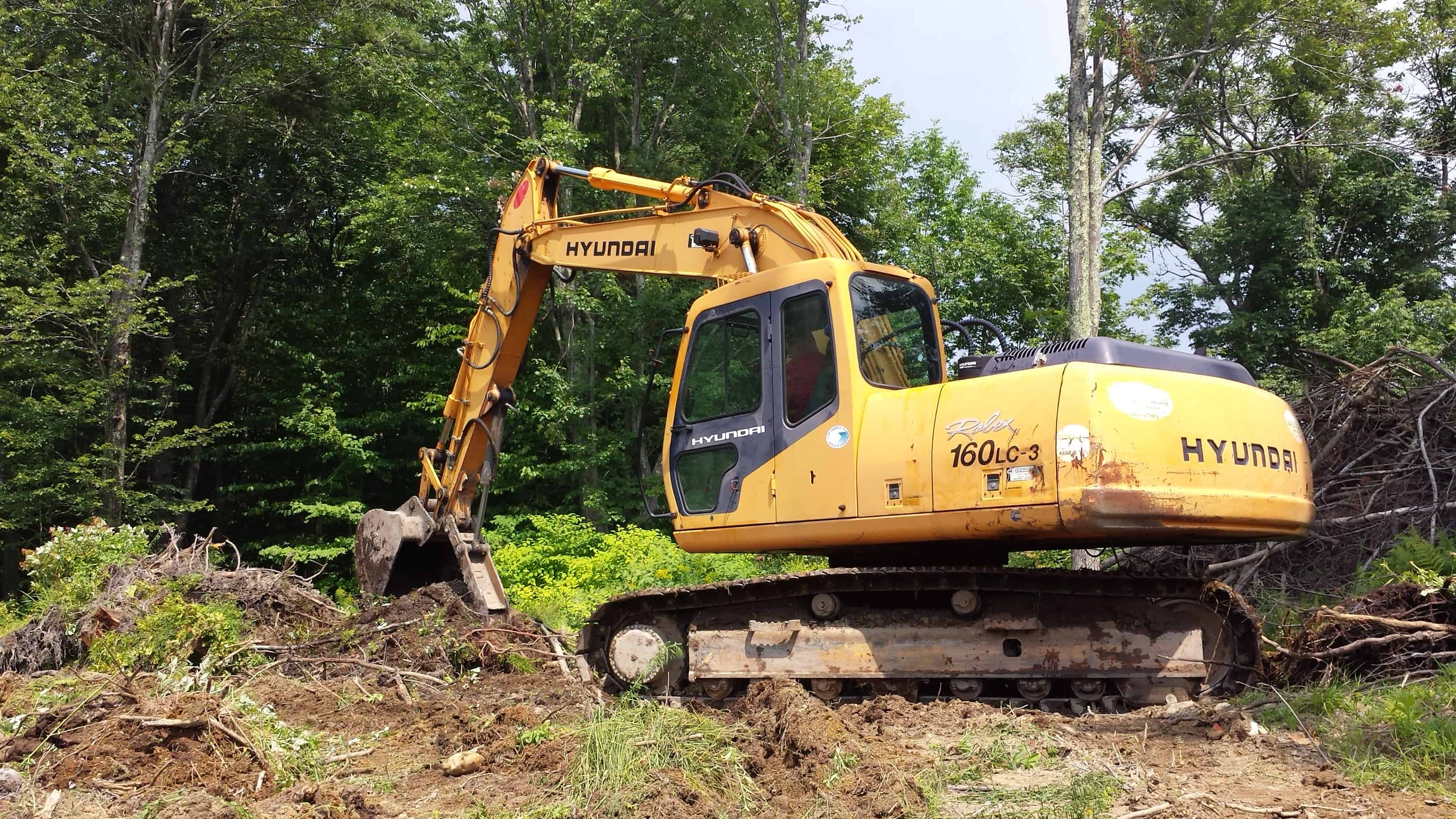 After clearing the trees in this yard expansion project, Top Notch Landworks brought in a excavator to remove the stumps. Stumps were carefully dug and piled to be hauled off.